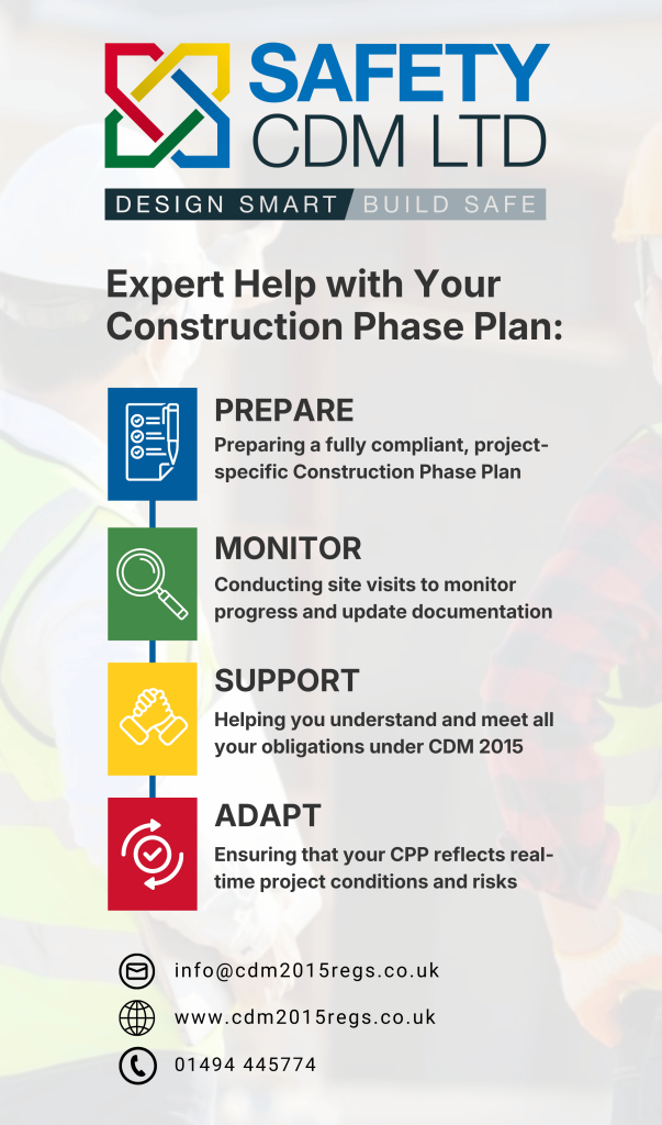 Using CDM expertise from Safety CDM Ltd, specialists in construction health and safety under the CDM 2015 Regulations, helps ensure your Construction Phase Plan is practical, proportionate, and fully compliant.